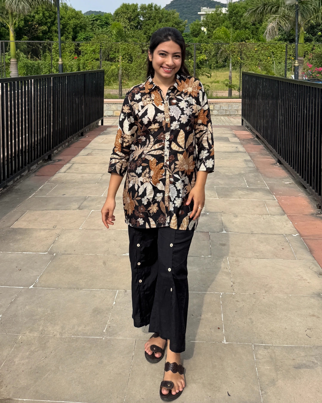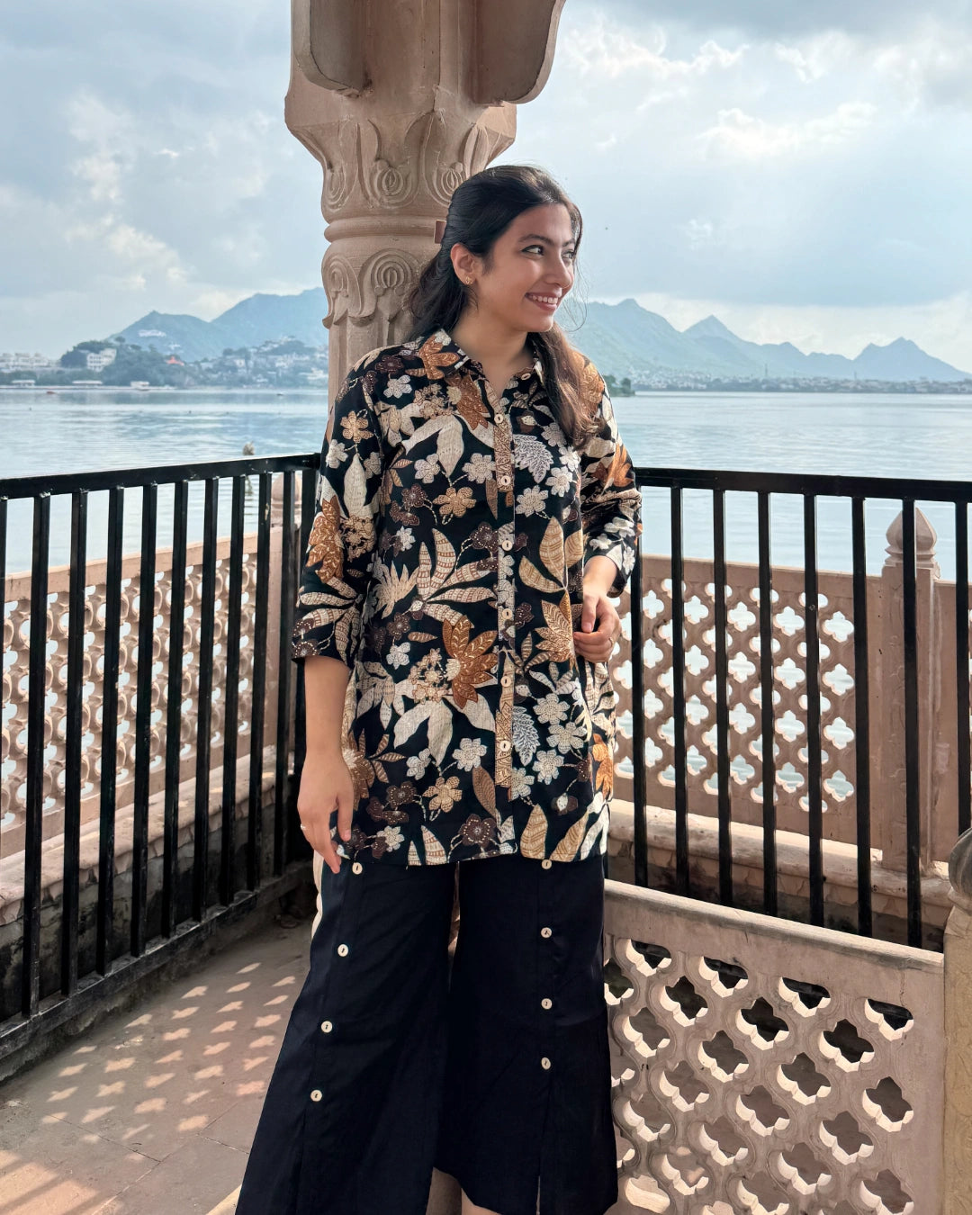 Elevate your wardrobe with this Black Shirt Coord-Set, featuring a stylish printed shirt top paired with flowy palazzo-style bottoms. The shirt’s print adds a touch of elegance, while the button detailing on the palazzo bottoms enhances the overall look with subtle sophistication. Perfect for versatile occasions, this coordinated set combines comfort and contemporary fashion effortlessly.