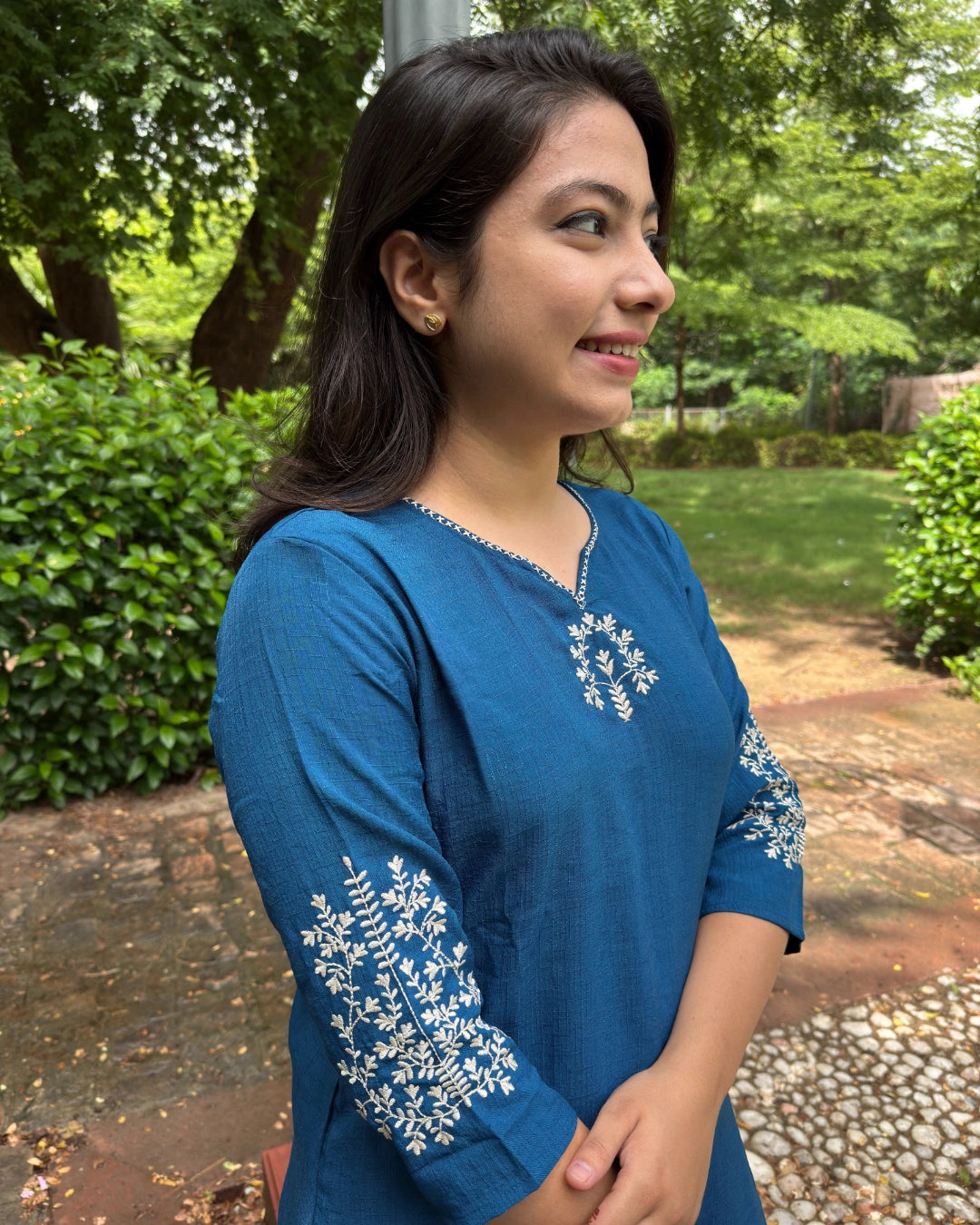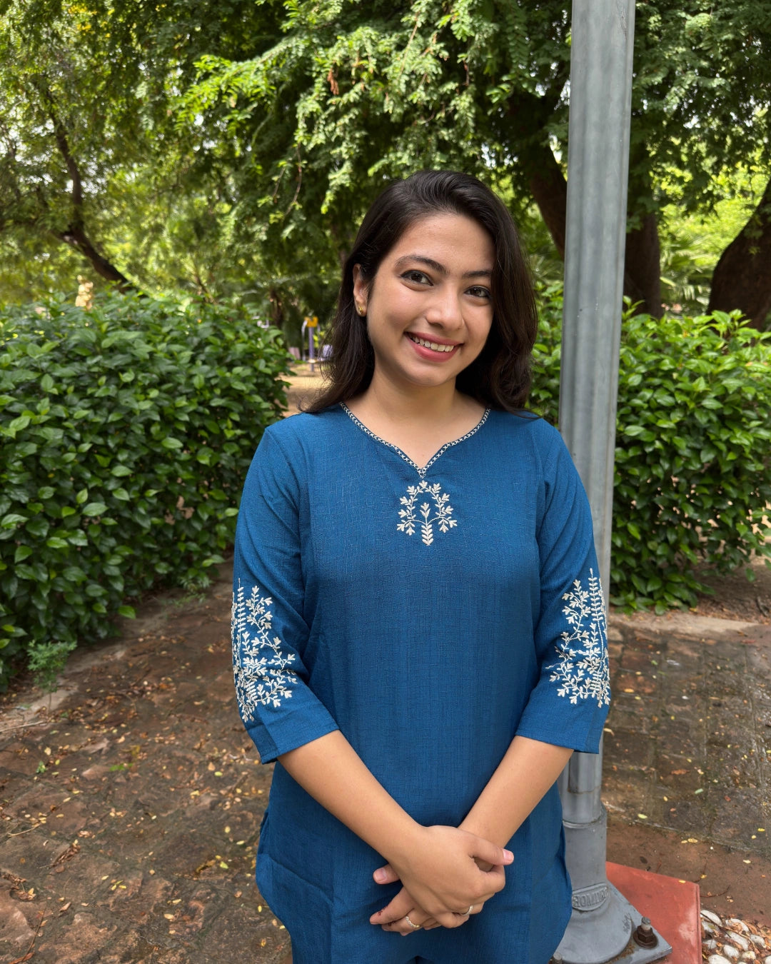 Enhance your wardrobe with this bright blue coord set featuring intricate machinework on the neck and sleeves. Designed with a flattering hip cover length, it offers both style and modest coverage, making it perfect for any occasion. Experience the blend of comfort and elegance in one coordinated outfit.