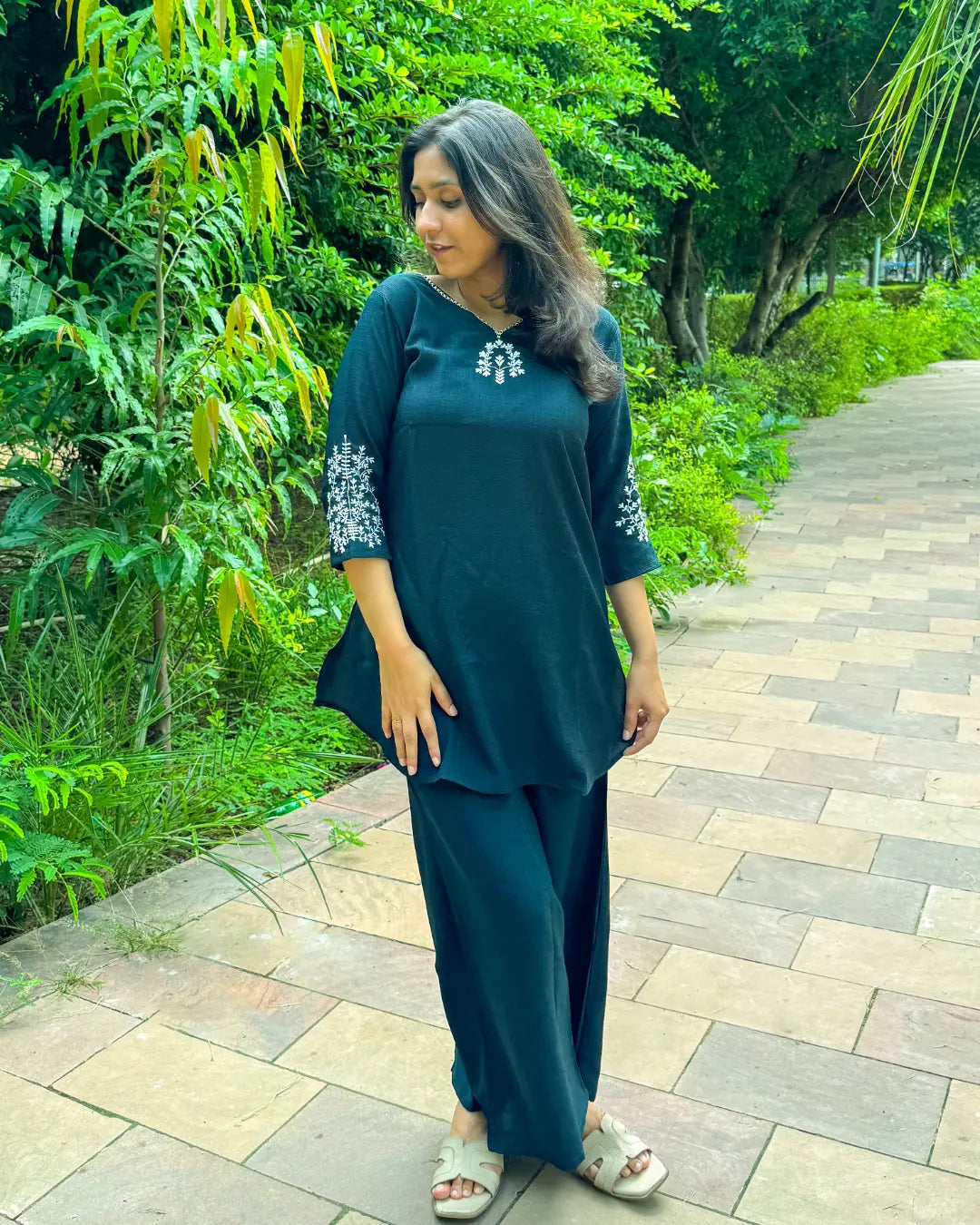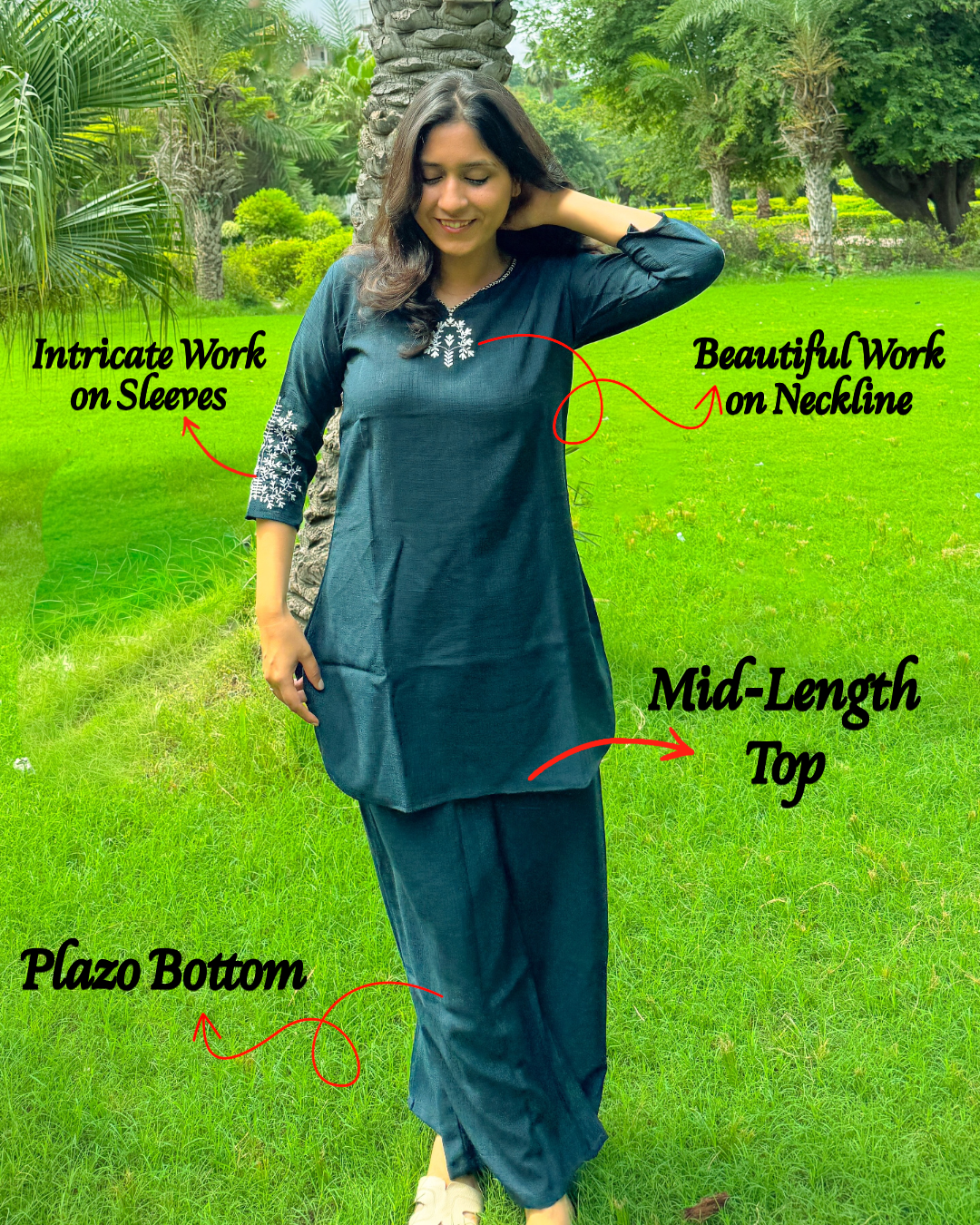 Elevate your everyday wardrobe with this Bottle Green Coord Set, designed for effortless style and comfort. Featuring intricate machine work on the neck and arms, it adds a refined touch without compromising on ease. Perfect for daily wear, this set combines subtle elegance with durable craftsmanship to keep you looking polished all day long.