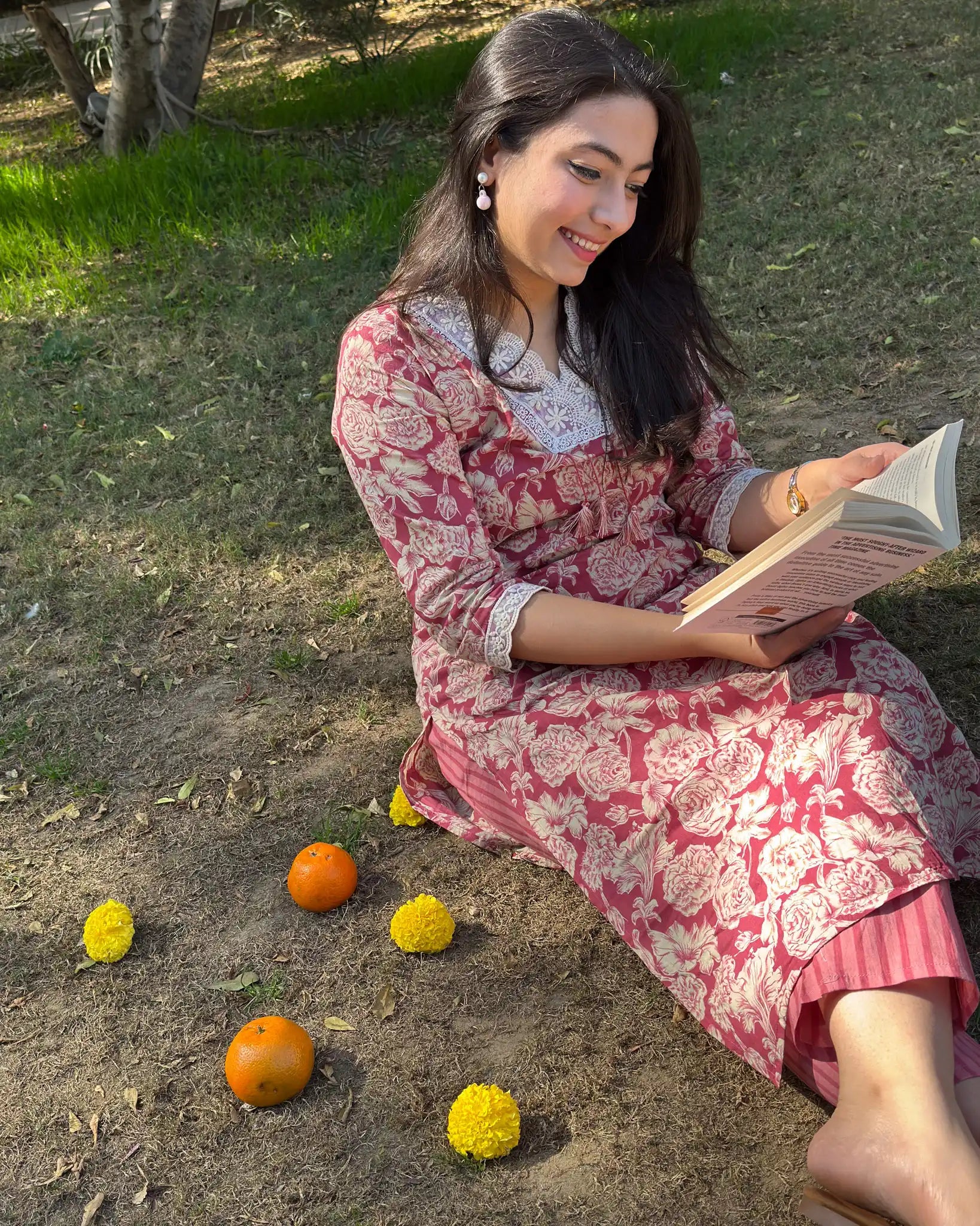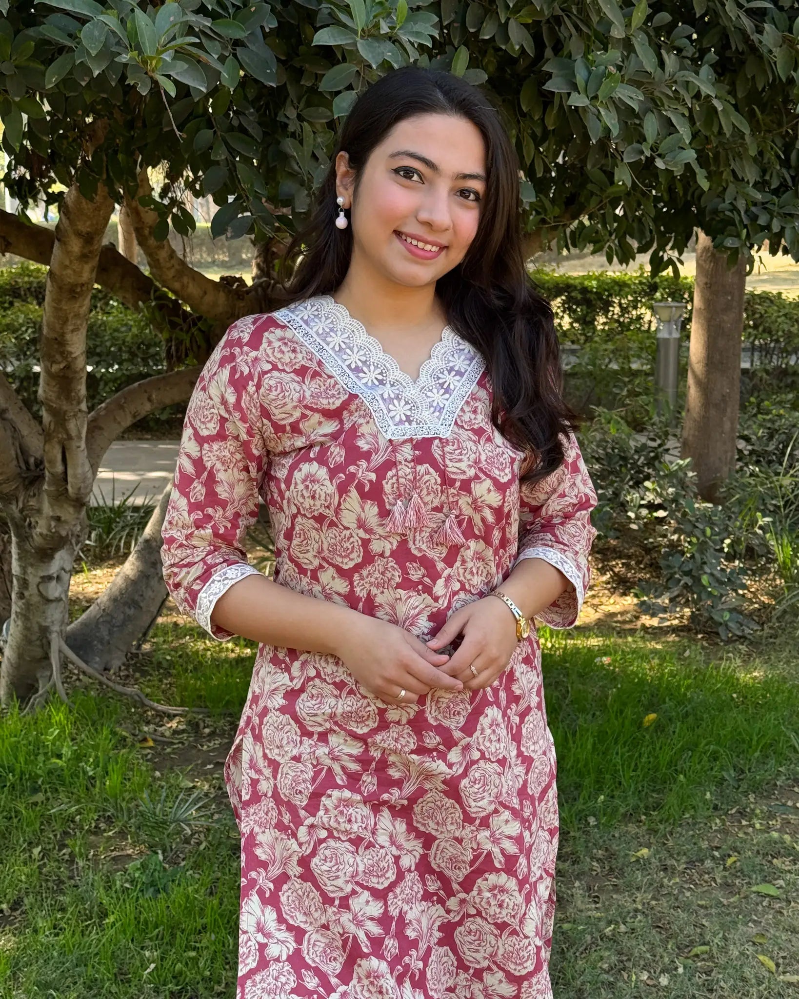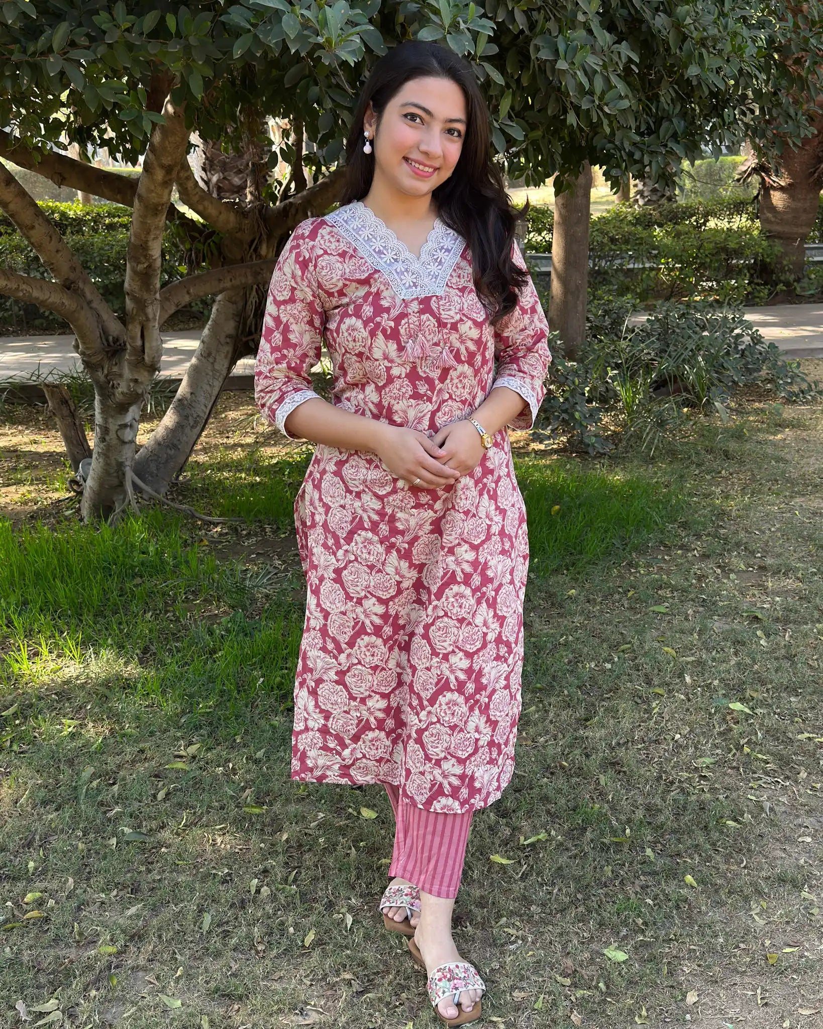 Elevate your ethnic wardrobe with this stunning dusty rose pink 2-piece ensemble. The kurta features delicate floral prints paired with intricate organza lace detailing at the neckline, while sheer organza lace adorns the sleeves for an ethereal touch. The coordinating bottom showcases a sophisticated striped pattern that perfectly complements the kurta's design. This thoughtfully crafted set combines traditional elegance with contemporary style, making it ideal for festive occasions, celebrations, or whenever you want to make a graceful impression. The soft rose hue flatters all skin tones, while the layered lace work adds dimension and visual interest. Perfect for those who appreciate refined details and timeless sophistication.