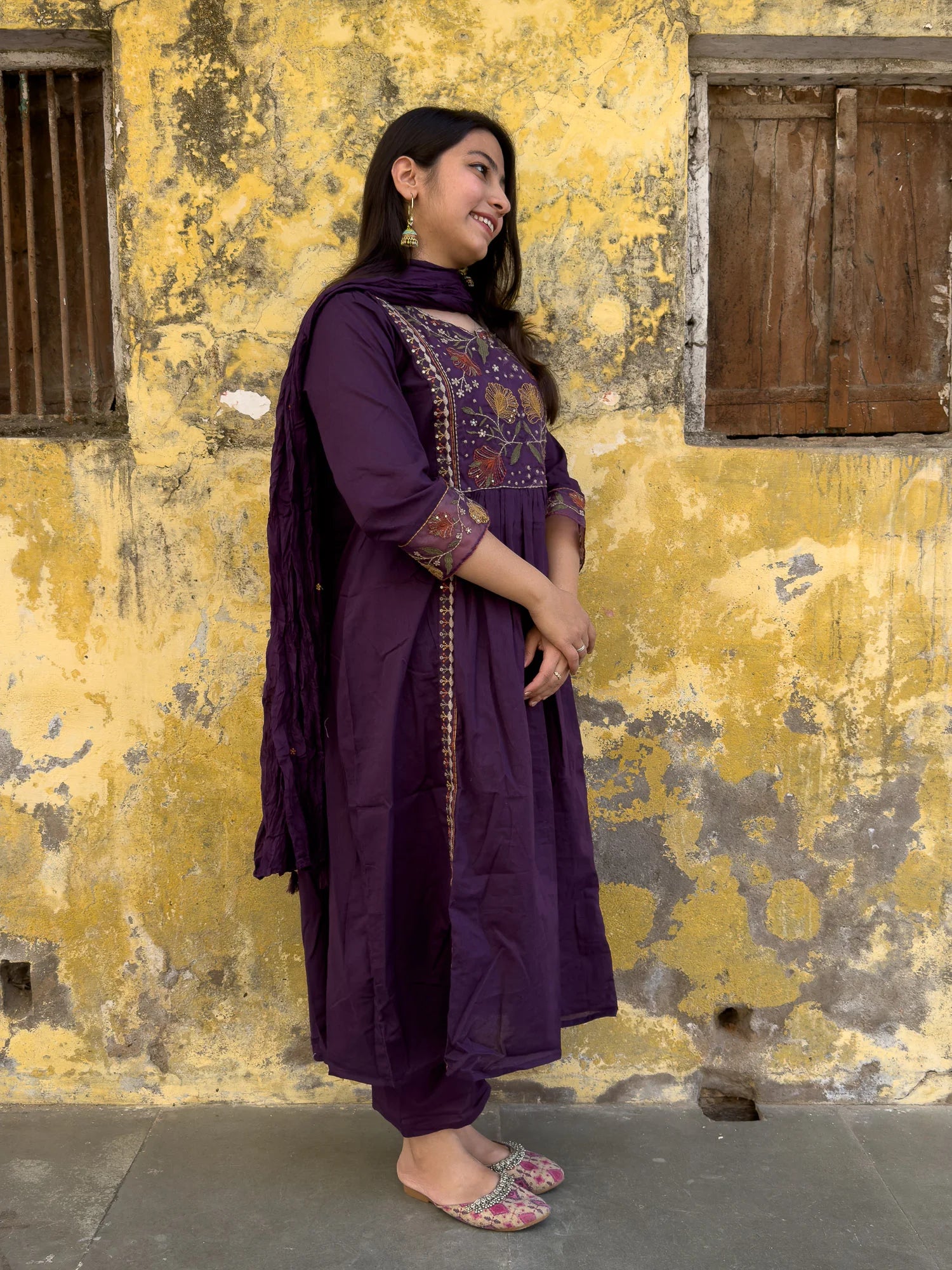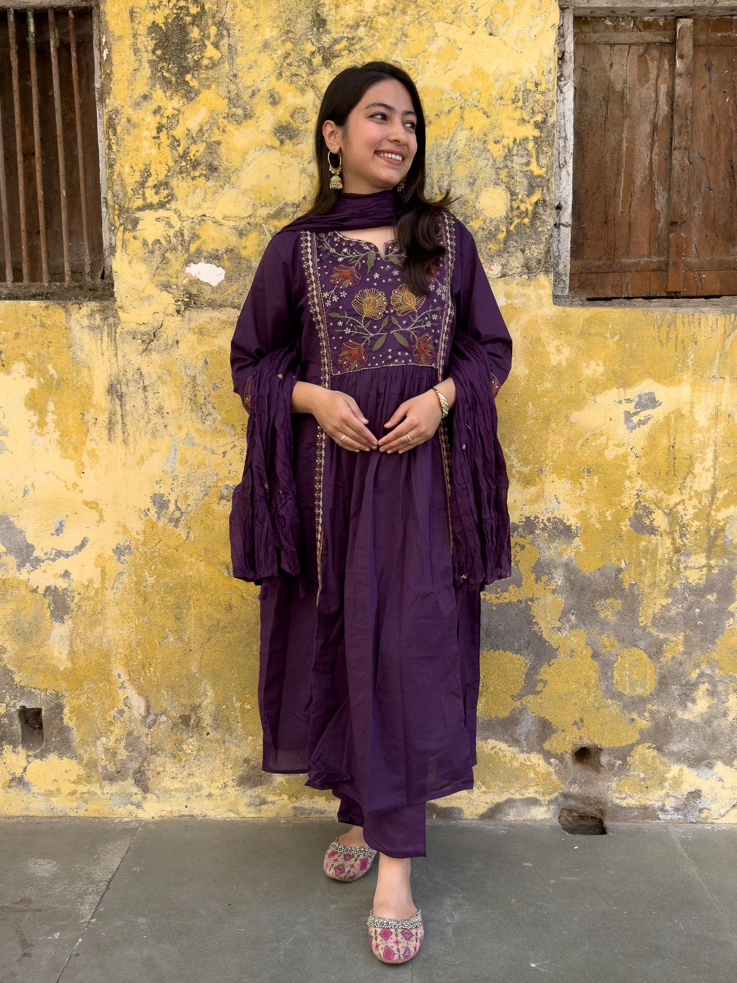 Experience the vibrant colors and stylish design of our Roslic™ purple kurta set! Made with pure cotton and adorned with multi-colored floral embroidery on the neck and sleeves, this long kurta is perfect for summer and day outs. Complete your look with the soft and breezy mul mul dupatta. Elevate your wardrobe with this must-have piece!
