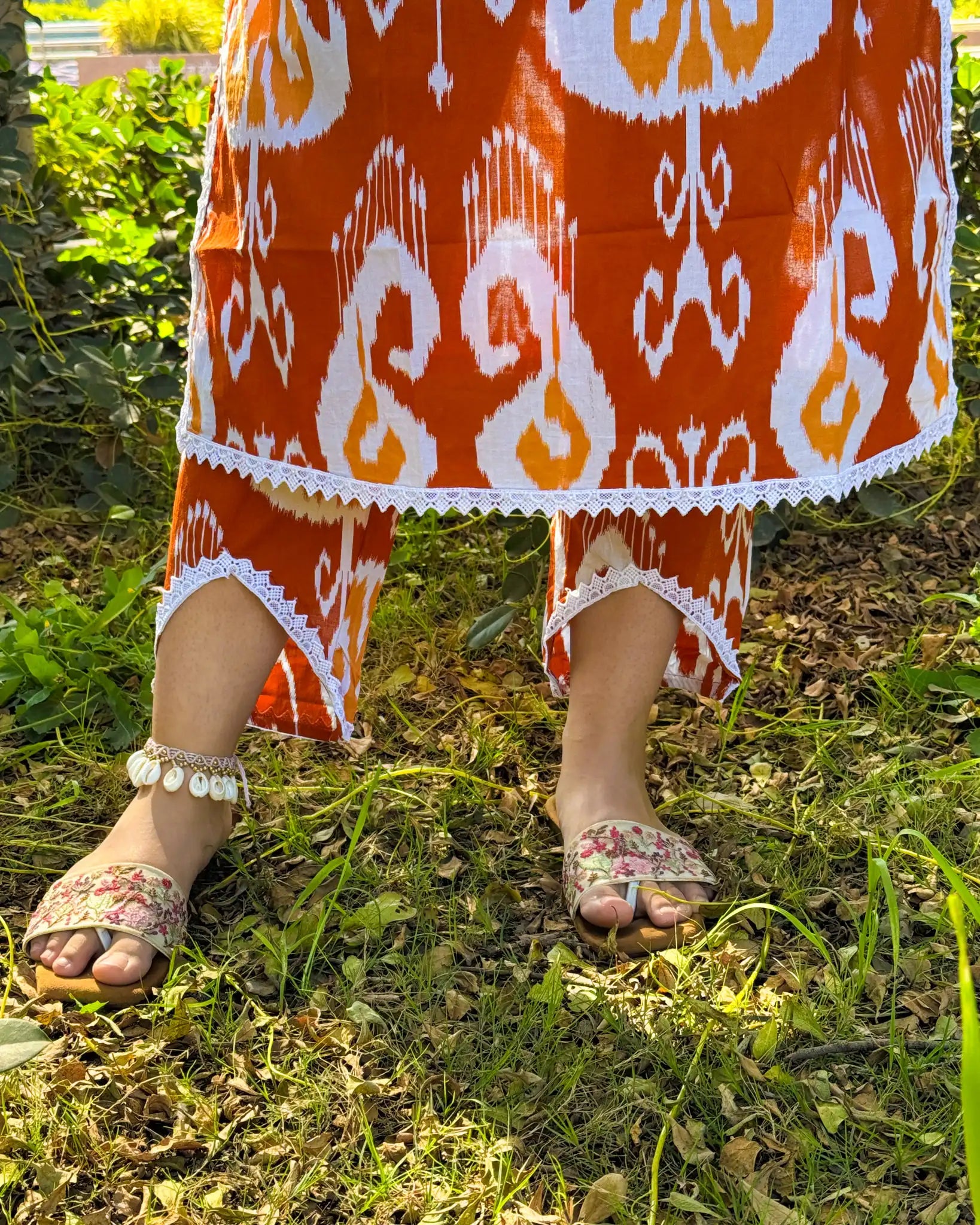 Elevate your ethnic wardrobe with this stunning cotton coord set that seamlessly blends traditional craftsmanship with contemporary style. The kurta features exquisite pearl handwork adorning the neckline, creating an eye-catching focal point that draws admiration. Delicate lacework frames the kurta, adding layers of sophistication and texture. The coordinating bottom showcases an intricate cut pattern finished with refined lace detailing, ensuring a polished, put-together look from every angle. Perfect for festive occasions, celebrations, or when you want to make a graceful impression, this coord set offers comfort without compromising on elegance. Crafted from breathable cotton, it's ideal for the Indian climate while maintaining that coveted premium aesthetic.