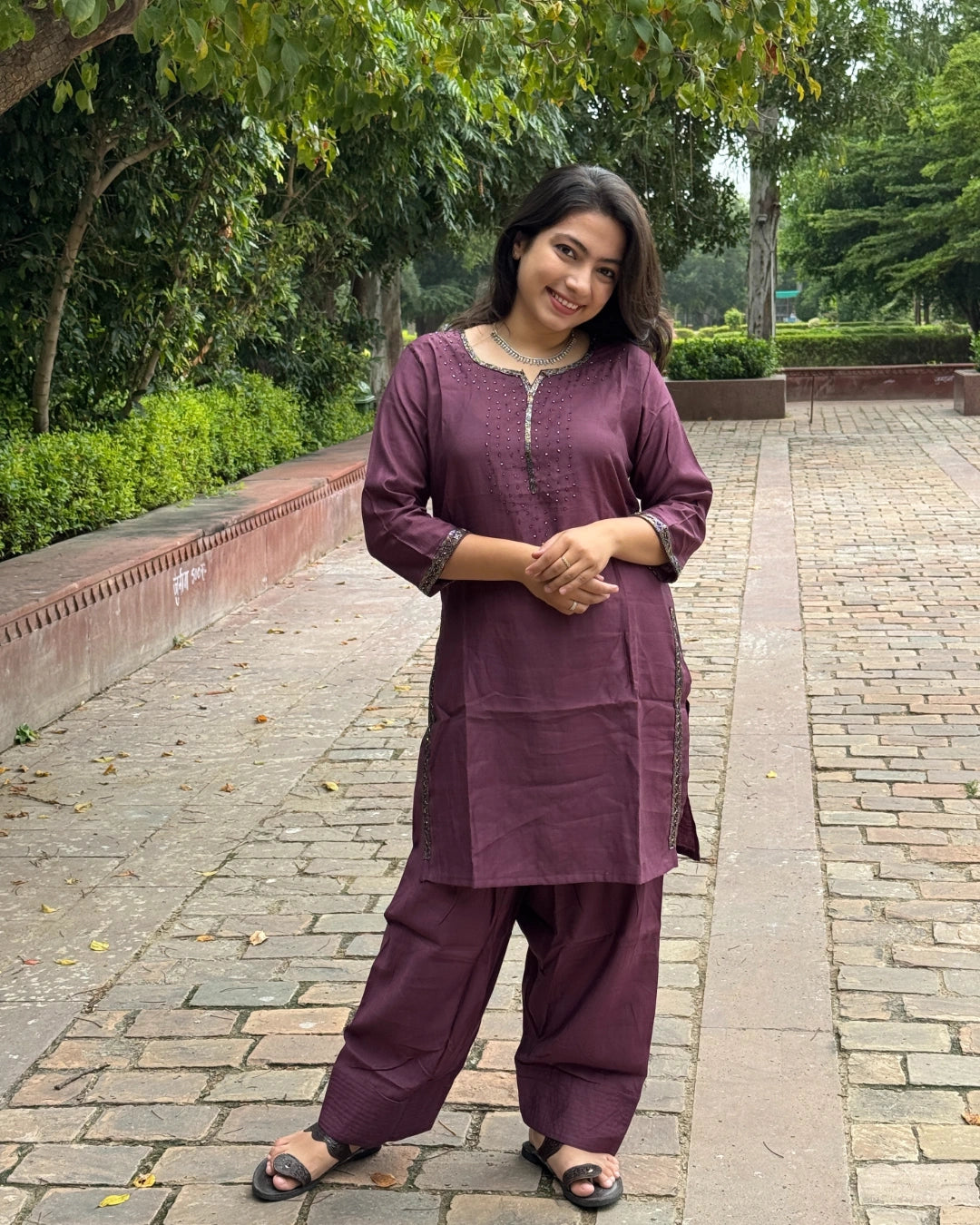 Elevate your ethnic wardrobe with The Farshi Coord (onion), featuring exquisite handwork on the neckline, sleeves, and kurta borders. This mid-length kurta pairs perfectly with a traditional farshi salwar, blending classic charm and modern style. Ideal for festive occasions, its intricate detailing ensures you stand out with elegance and grace. Experience comfort and sophistication in one beautiful set.